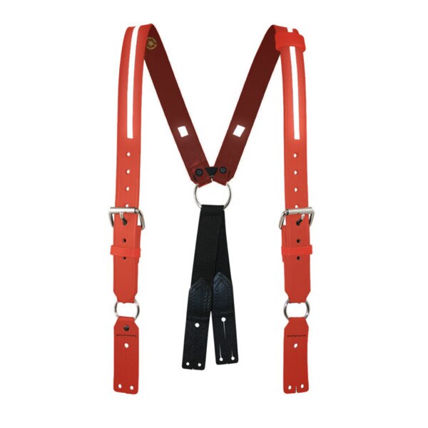 Two 1-1/2" adjustable straps with roller buckles are strong enough to hold turnout pants. Top grain, red leather, sewn and riveted at all stress points. 8-point button connection. Available in Regular and XL sizes. Also available with a 1/2" sewn-on reflective material. These RED suspenders are a fine addition to our line of leather fire fighters accessories.