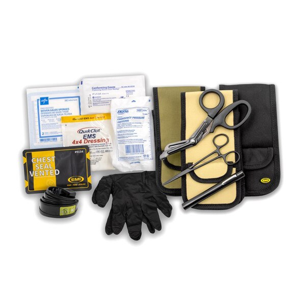 Respond to critical tactical/medical emergencies with E.T.R Quick Response Holster Set. It is made of 1000 Denier nylon which is non-porous and waterproof. It has a quick-release velcro belt loop for easy attachment and removal from belts, gurneys, kits, etc. The holster includes a front pocket for gloves, a large main compartment, and several instrument compartments.