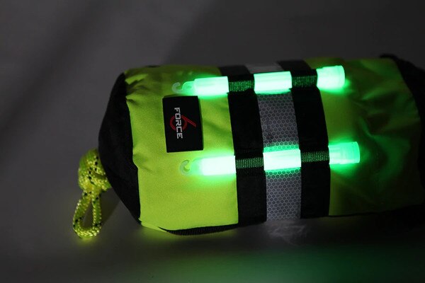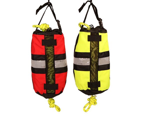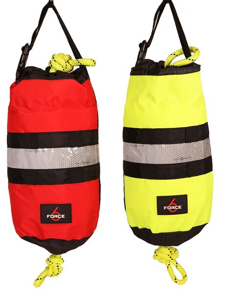 The Force 6 water rescue bags have 75' hi-vis yellow rope, side flotation, finger loops, dual light stick holder, and SOLAS reflective.