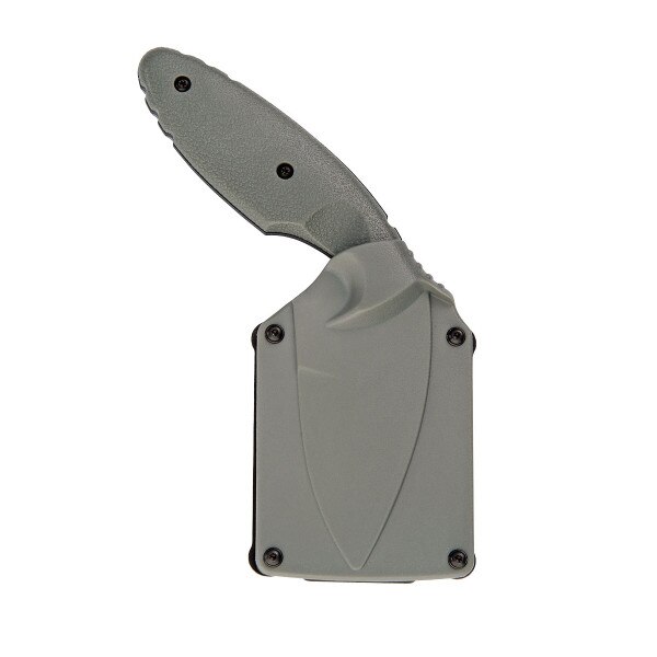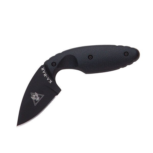 Straight edge made with non-reflective black powder coated Aus 8 blade and a textured ABS plastic handle which can be worn on the right or left side of a pant belt. Drop point blade measures 2 5/16 inches at a 15 degree angle. Designed by John Benner, founder of the Tactical Defense Institute. Off-hand knife that draws like a pistol. This knife can be used in extreme close quarters where a suspect is attempting to take an officer's handgun. TDI knife is used as a last defense option.