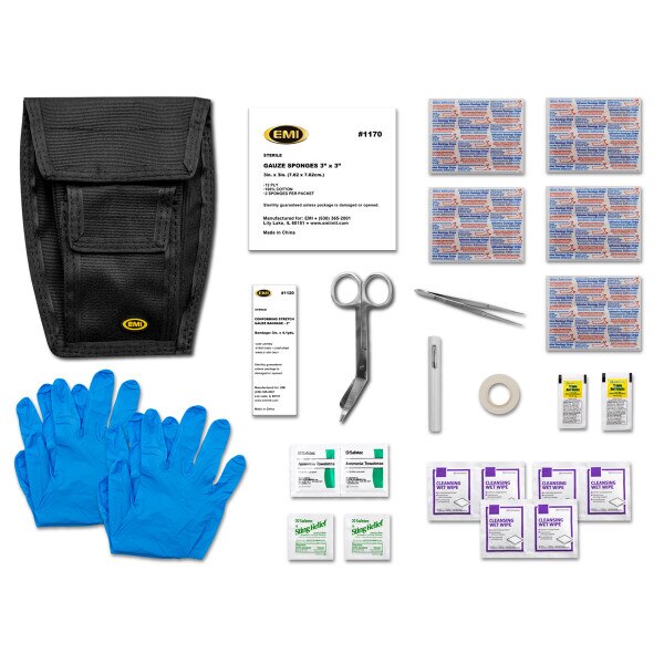 When the need arises for a compact personal first aid kit, Quick Aid™ is the answer. Quick Aid™ has all the essential first aid supplies and more to treat basic emergencies. The durable cordura pouch has four pockets with velcro closures and measures 6 1/4 "x 5" x 2". It fits easily on belts, inside cargo pockets, glove compartments, etc. Quick Aid™ is ideal for first responders, fire fighters, police officers, etc. when the need for a basic first aid kit is required.