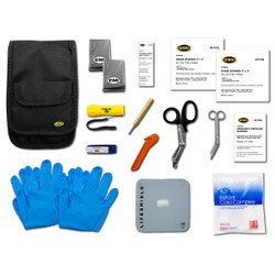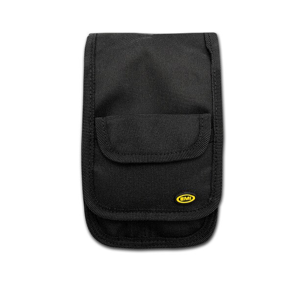 The holster is made of 1000 Denier nylon which is non-porous and waterproof. It has a quick-release velcro belt loop for easy attachment and removal from belts, gurneys, kits, etc. The holster includes a front pocket for gloves, a large main compartment, and several instrument compartments.