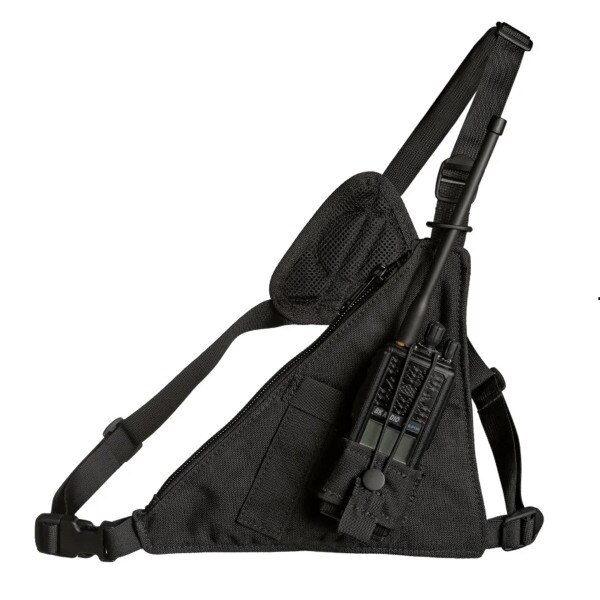 Wolfpack Gear Triangular Radio Harness, a single radio harness providing lightweight options for communications. Breathable mesh reinforcements offer up the ultimate in comfort while offering a large triangular stash pocket.